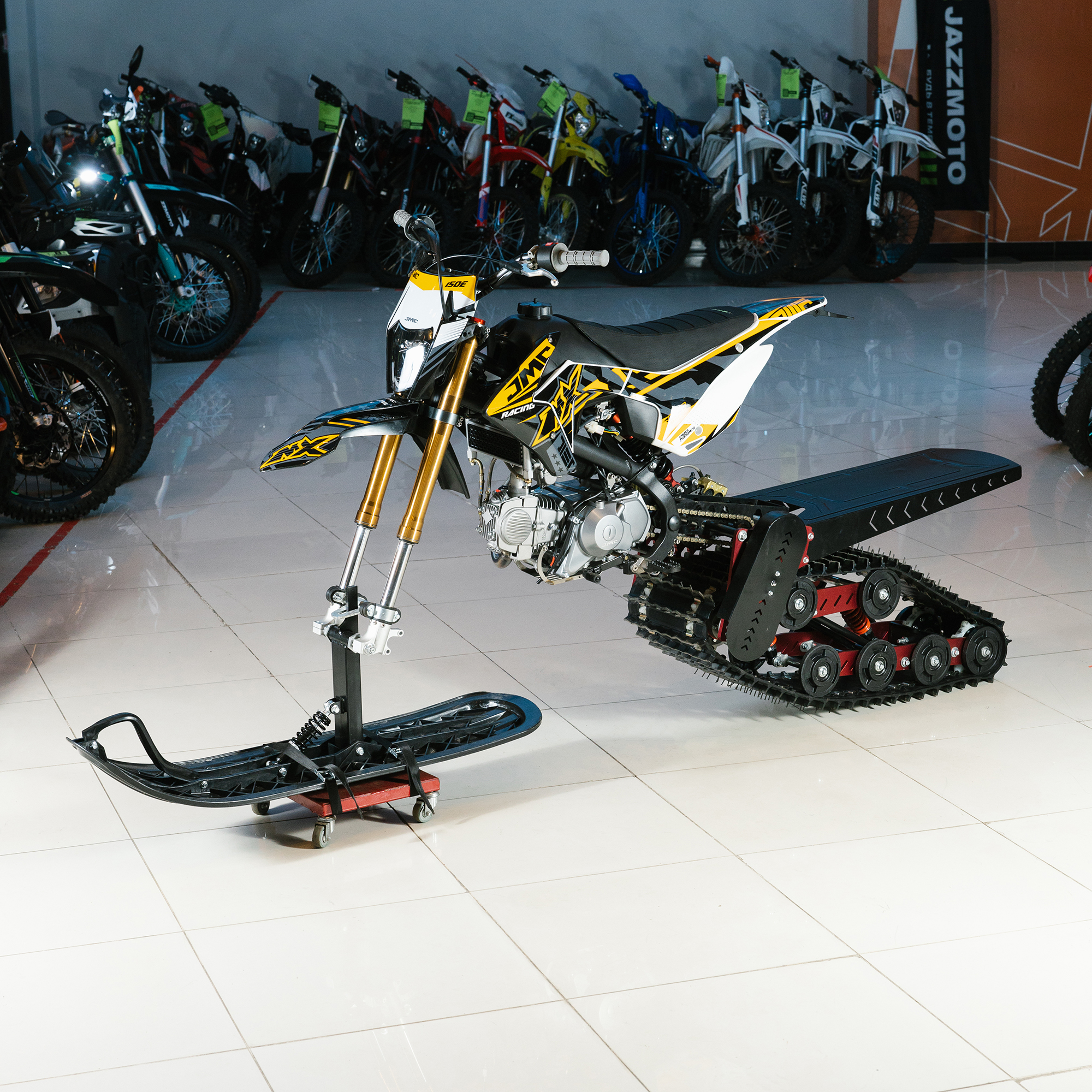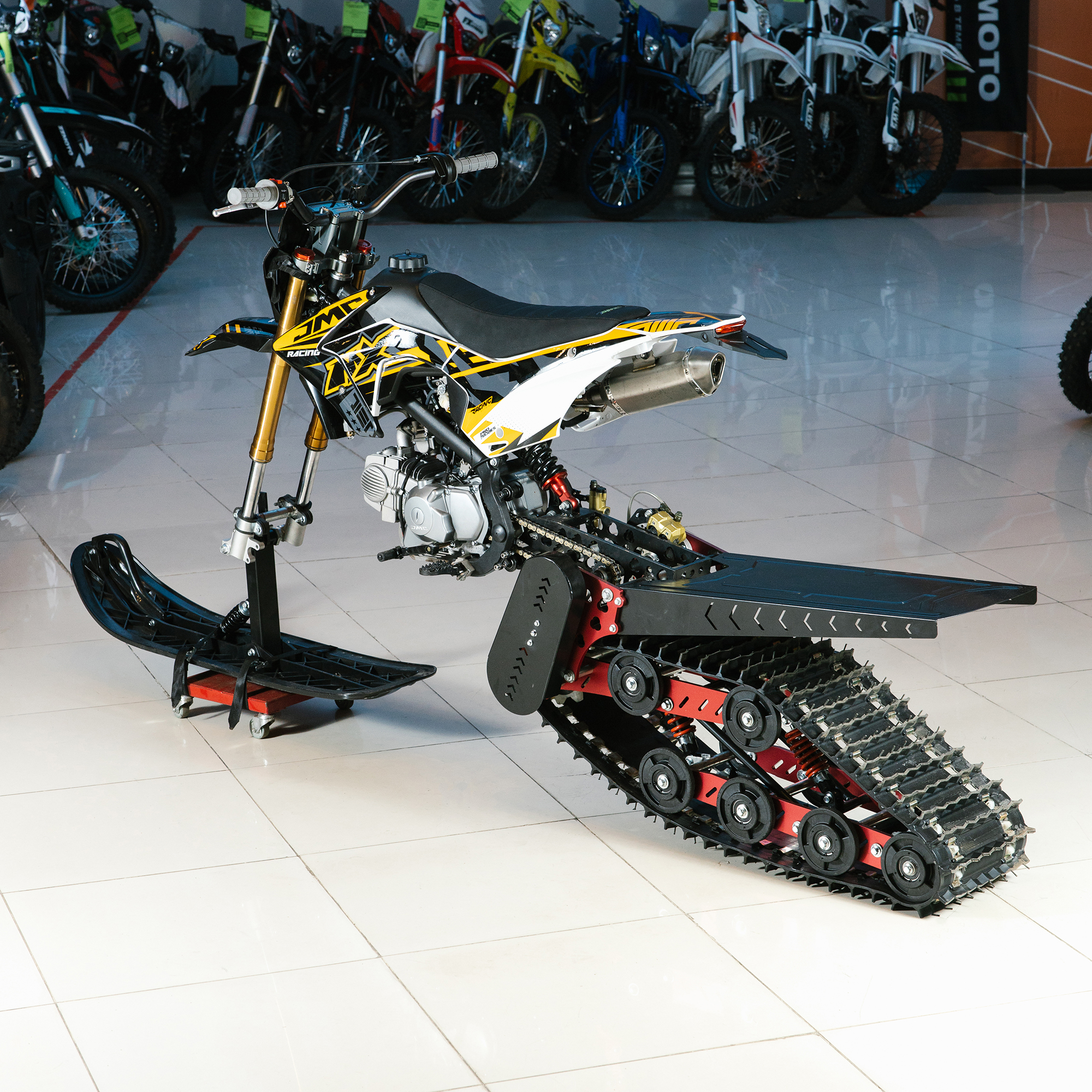 Универсальный гусеничный комплект для внедорожных мотоциклов. Гусеничный мотоцикл (СНОУБАЙК) это, по сути, одноколейный снегоход. Вы получаете возможность продлить мото сезон и эксплуатировать мотоцикл не только летом но и зимой.
