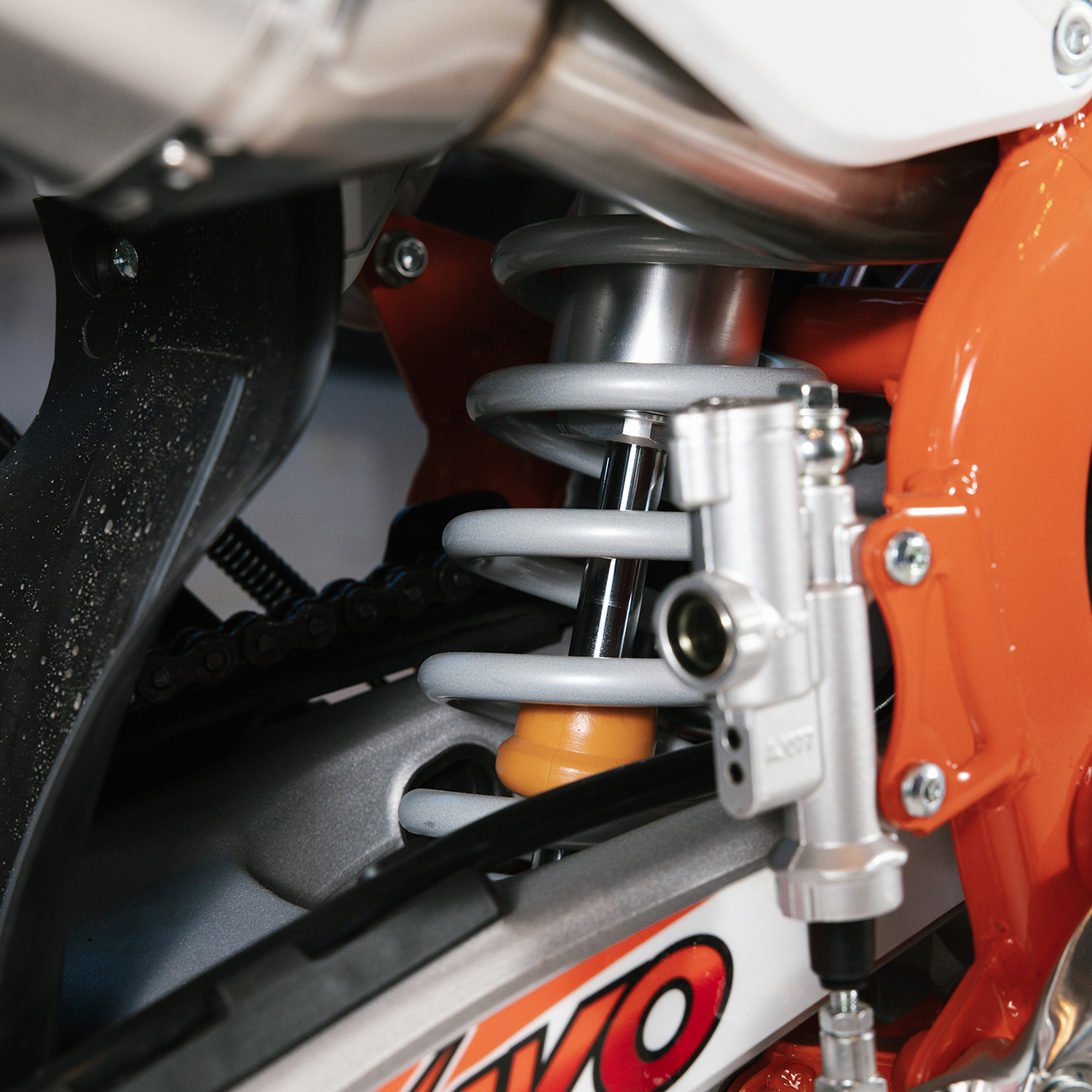 Ходовая часть включает переднюю подвеску KAYO Racing Performance (KRP), произведённую компанией KKE специально для KAYO, длиной 940 мм и задний моноамортизатор длиной 480 мм. Оба компонента оснащены полным набором регулировок. Это позволяет настроить мотоцикл под конкретные условия и стиль вождения, чтобы езда по неровностям была более плавной и устойчивой.