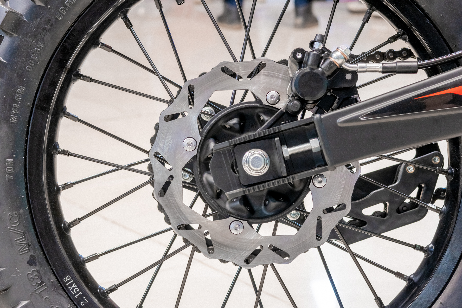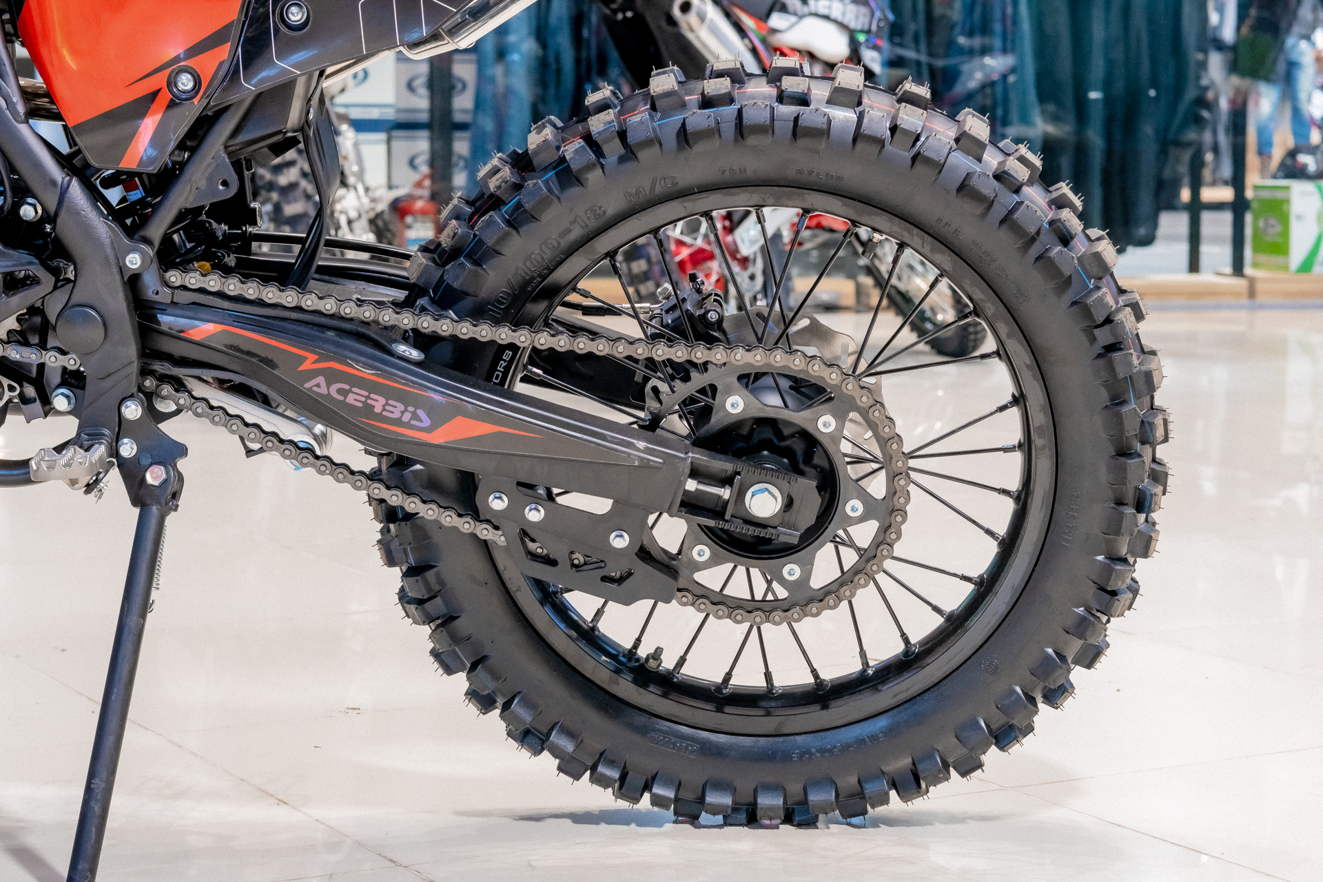 В переднем и заднем колесах установлены антибуксаторы, которые притягивают покрышку к ободу, позволяя ездить по бездорожью при низком давлении в камерах, не давая покрышке проворачиваться во время езды. Размер передней покрышки: 80/100-21. Размер задней покрышки: 120/100-18. Они прекрасно себя ведут по песку и грязи, что позволяет райдеру отлично показать себя на пересеченной местности.