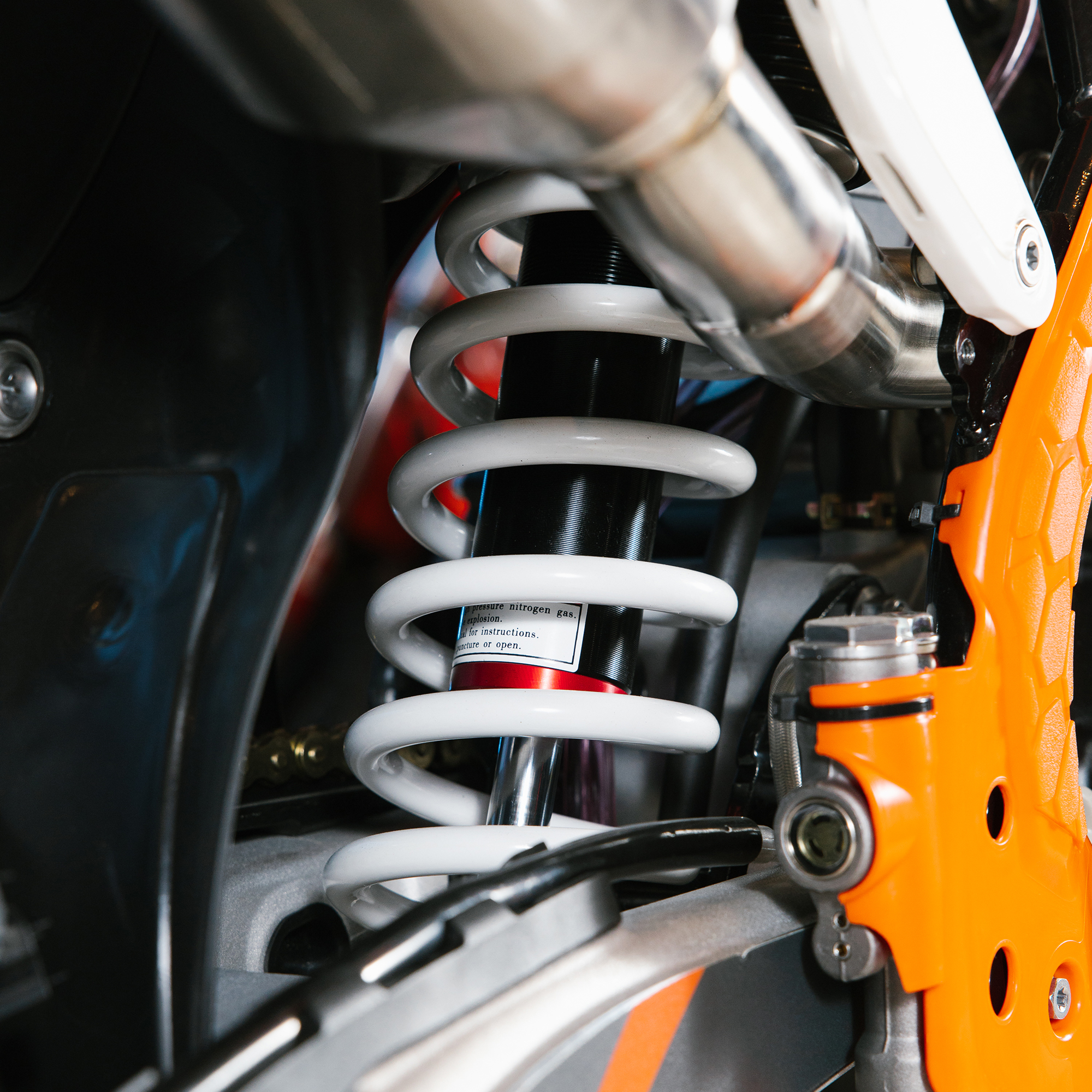 Передняя вилка "MNT" перевернутого типа T7 48- 910mm с регулировкой на сжатия и отбой. Моноамортизатор "MNT" также с регулировками. Система прогрессии, обеспечивает равномерную, мягкую работу и увеличивает длину рабочего хода подвески. Также ось крепления маятника совпадает с осью крепления ножки. Это существенно улучшает развесовку мотоцикла.