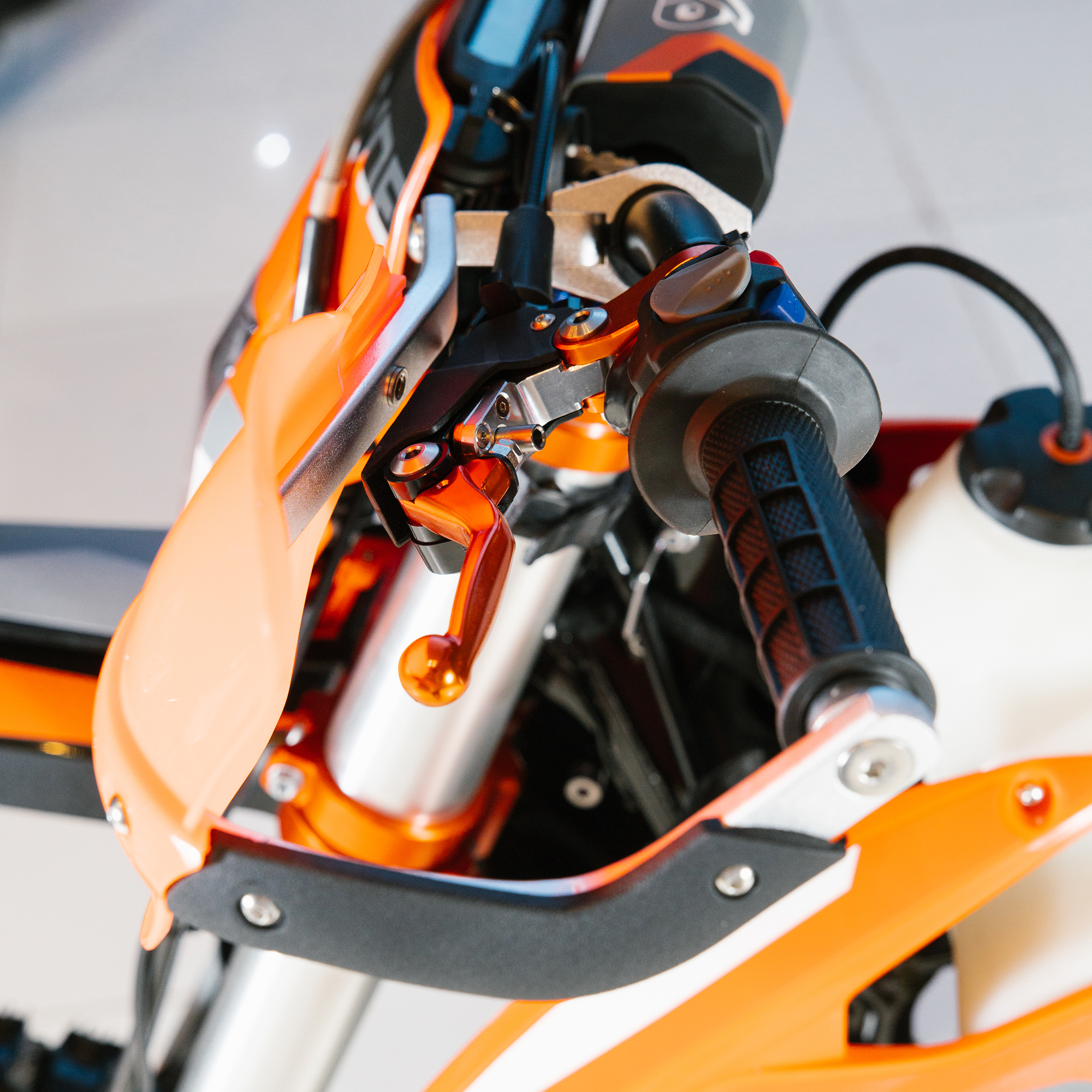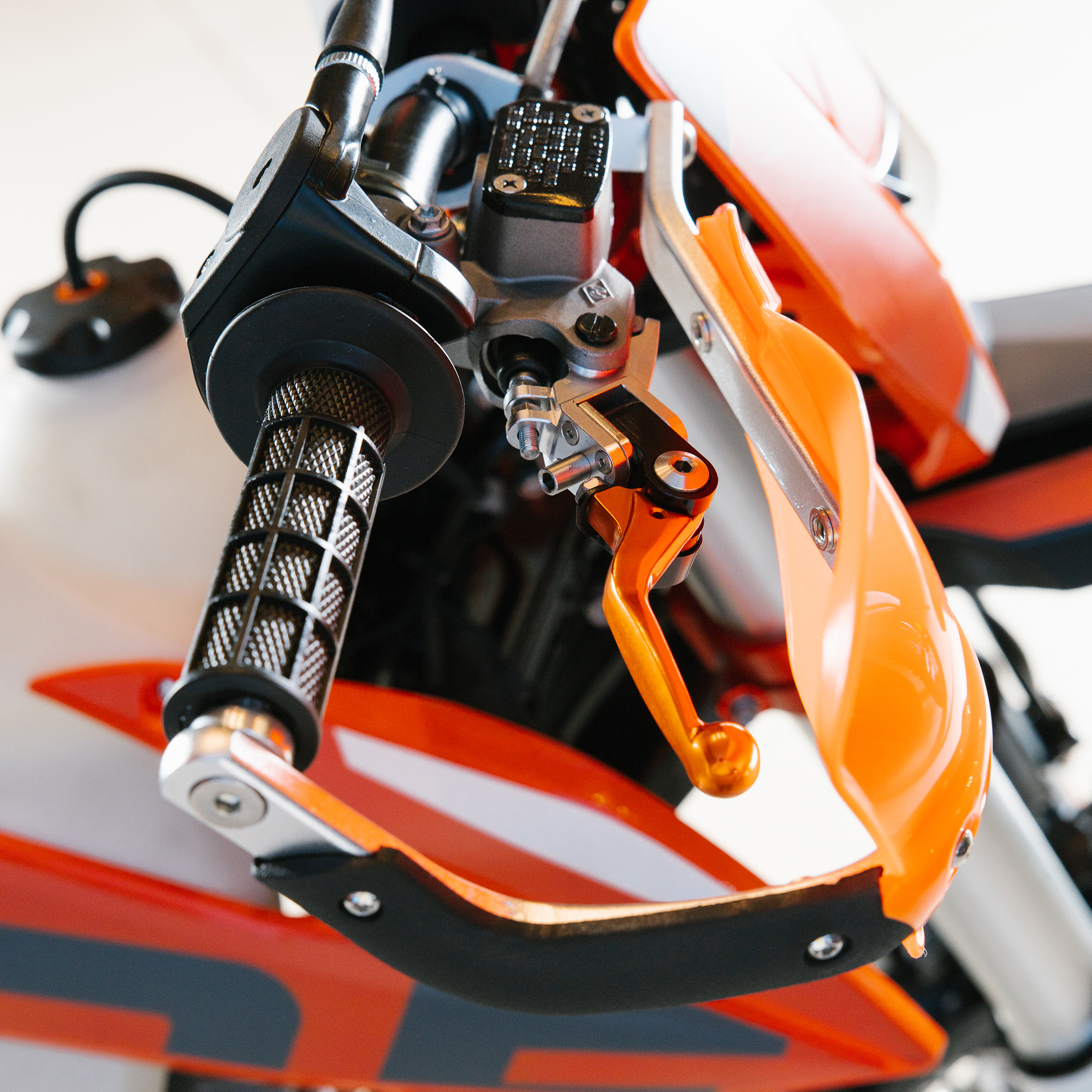 Электронная приборная панель, противоскользящее сиденье, защита рамы от протирания ботинками, подножки «AJ1» (алюминий 6063 с шипами), подножка боковая «AJ1» (алюминий 7075-Т6), невозгораемый воздушный фильтр «AJ1» – Twin Air с увеличенной площадью, ведомая звезда «AJ1» (520, алюминий 7075-Т6), защита рук, грипсы OTOM/Lock-On, передние и задние буксаторы «AJ1», откидные алюминиевые рычаги 270°, алюминиевая лапка КПП, пульт света КТМ, LED фара 5 линз, моточасы, фрезерованная траверса X trig .