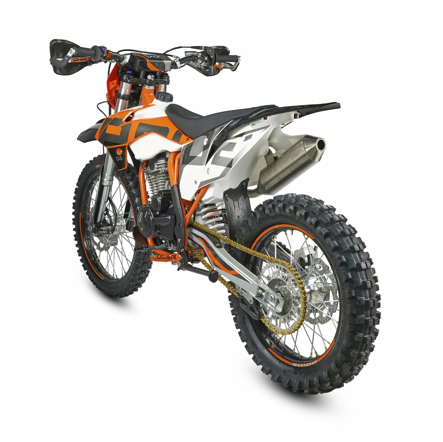 Спереди и сзади установлены антибуксаторы бренда "AJ1", которые притягивают покрышку к ободу, позволяя ездить по бездорожью при низком давлении в камерах, не давая покрышке проворачиваться во время езды. Размер передней покрышки: 80/100 R21. Размер задней покрышки: 120/90-R18. Модель комплектуется "жирной" резиной "KENDA". Все эти характеристики позволяют мотоциклу отлично себя чувствовать в песке и грязи.