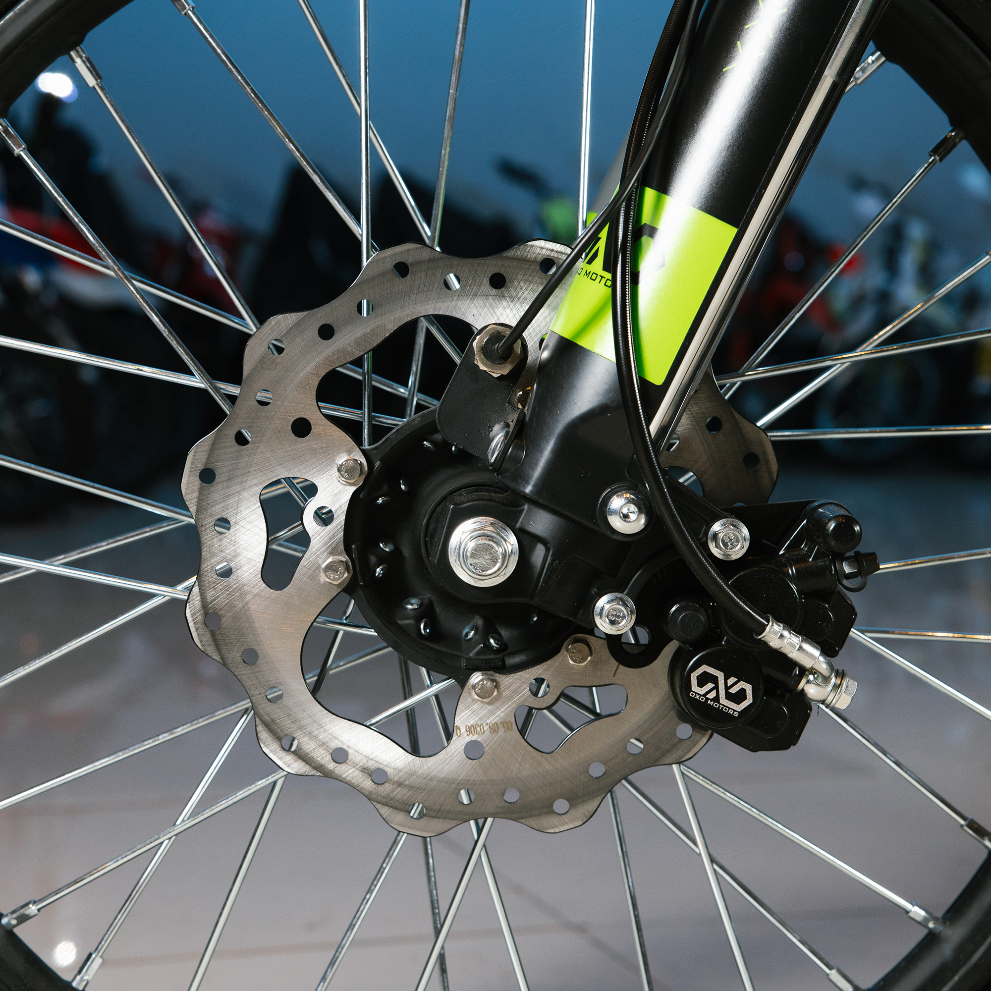 Тормозная система мотоцикла - полностью гидравлическая с армированными шлангами. Спереди и сзади установлен двухпоршневой суппорт. Данная конфигурация тормозных механизмов, позволит быстро и безопасно остановиться с максимальной скорости даже на бездорожье.