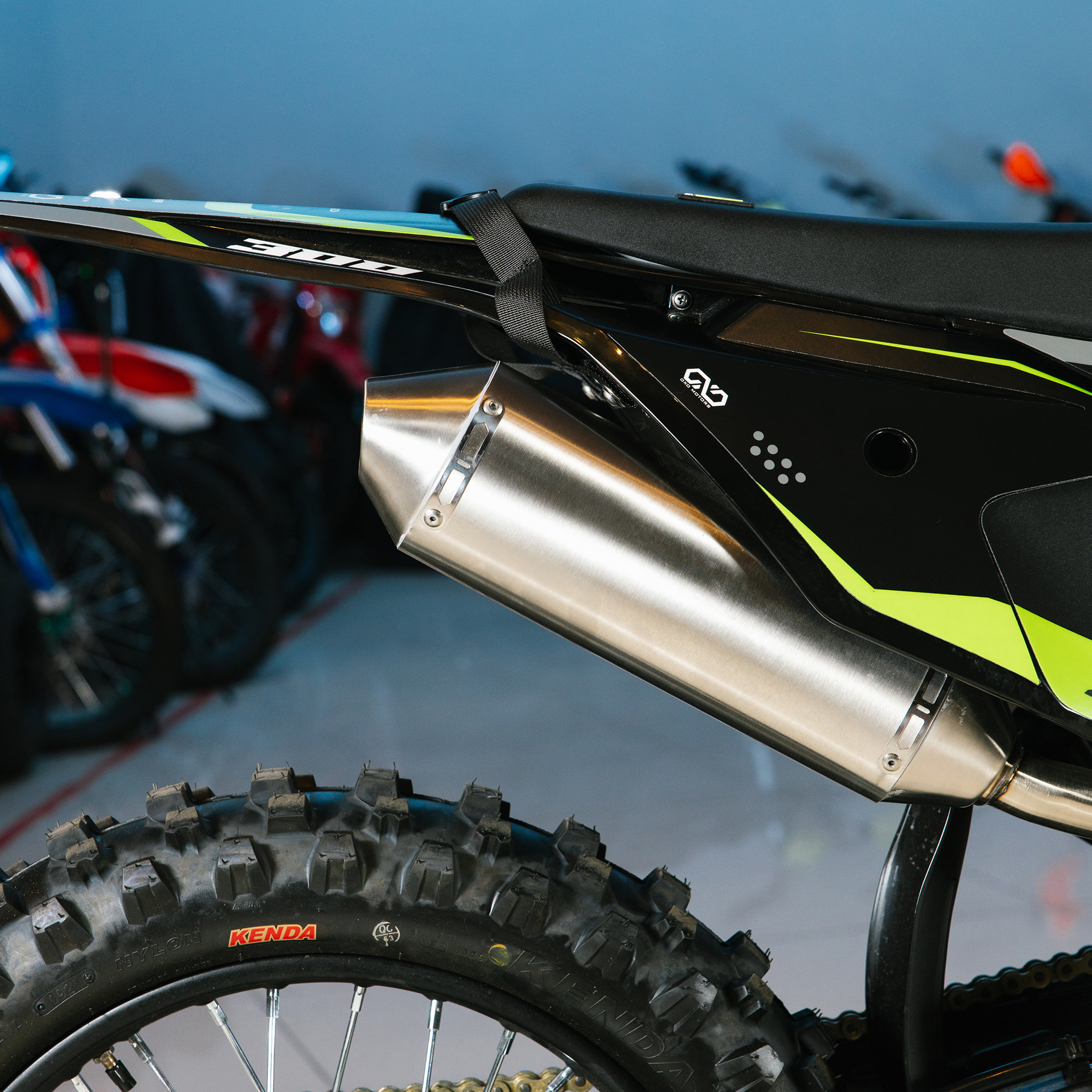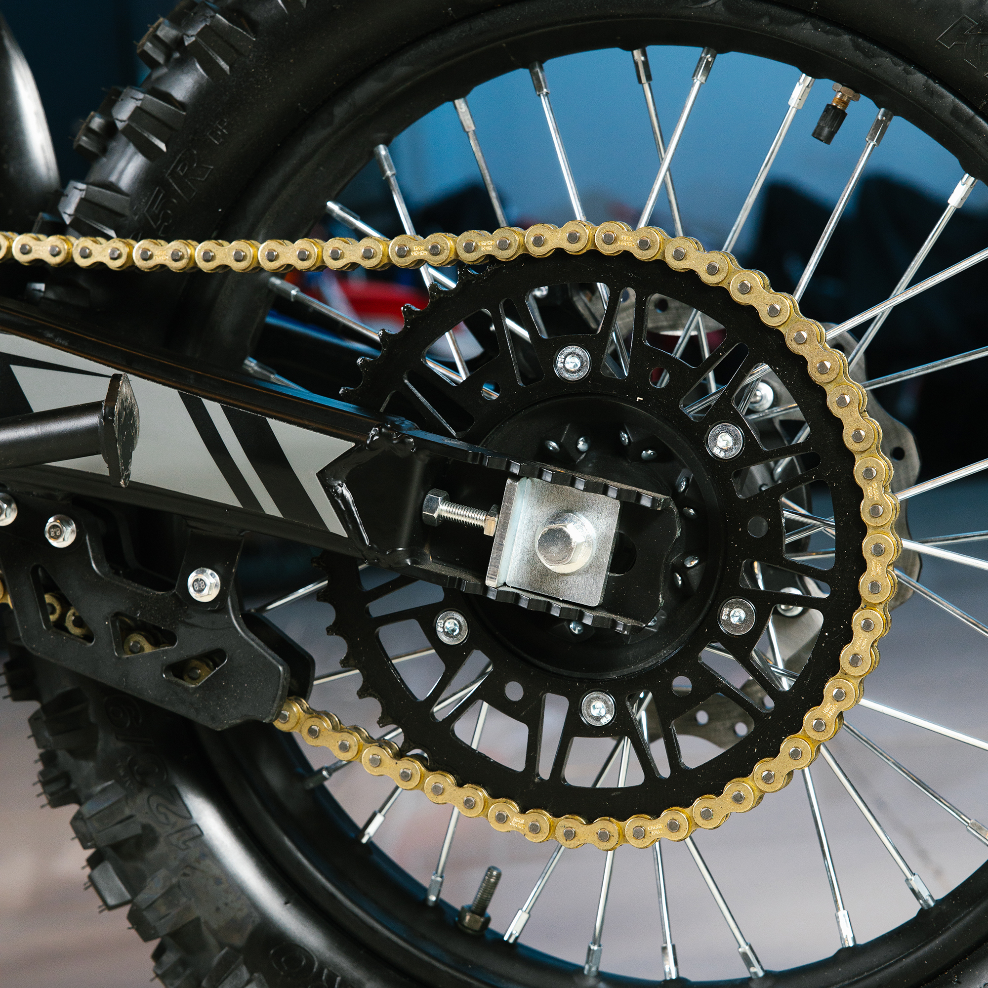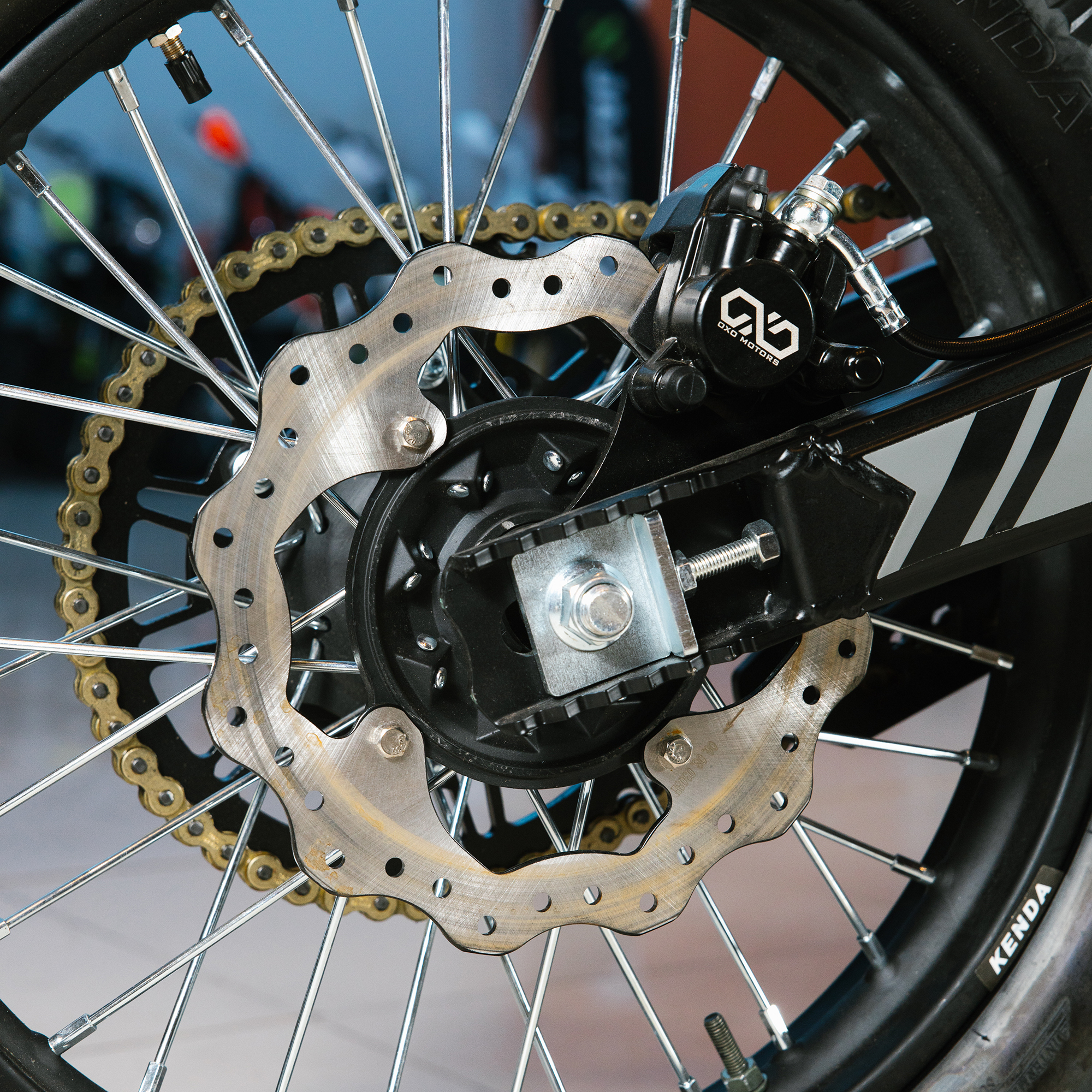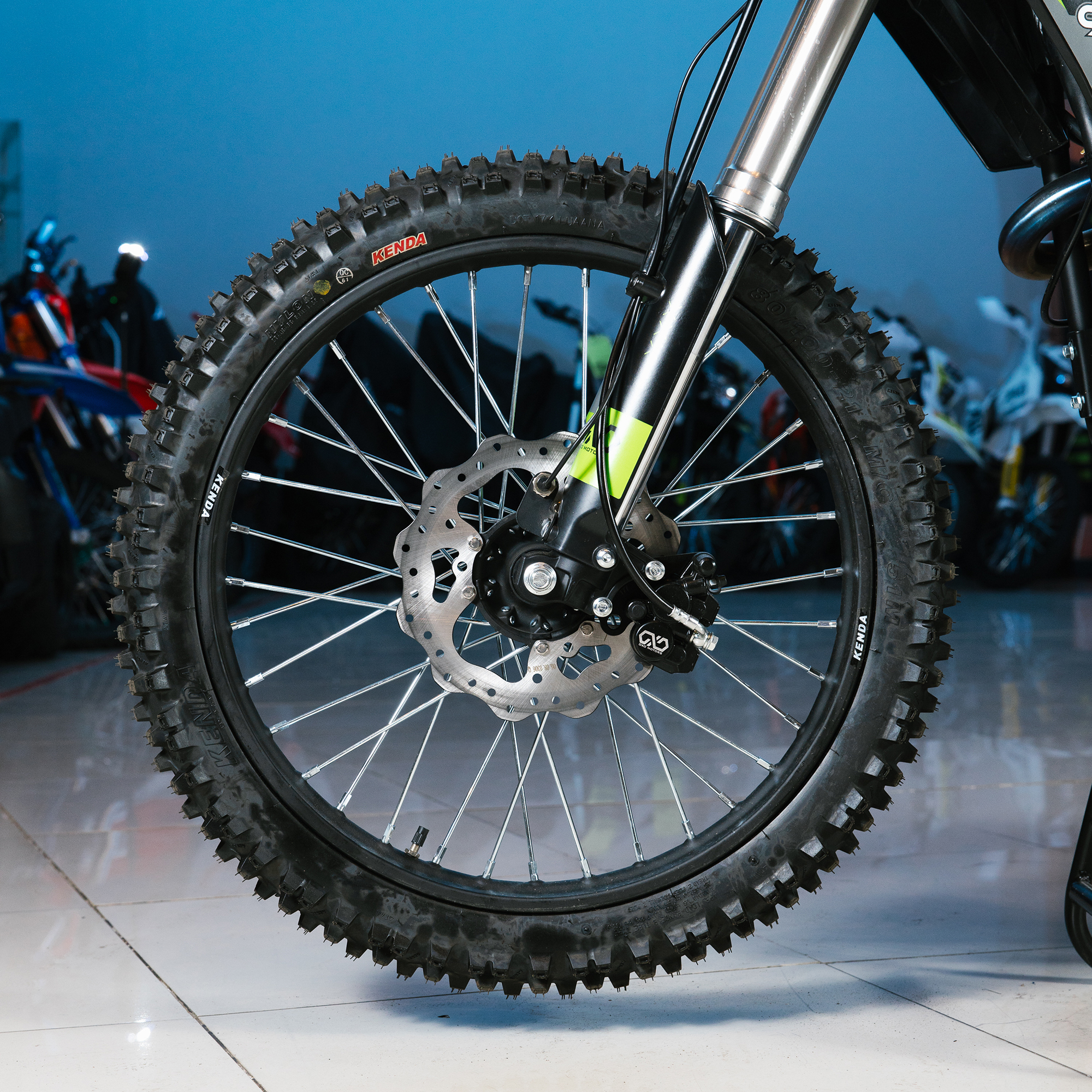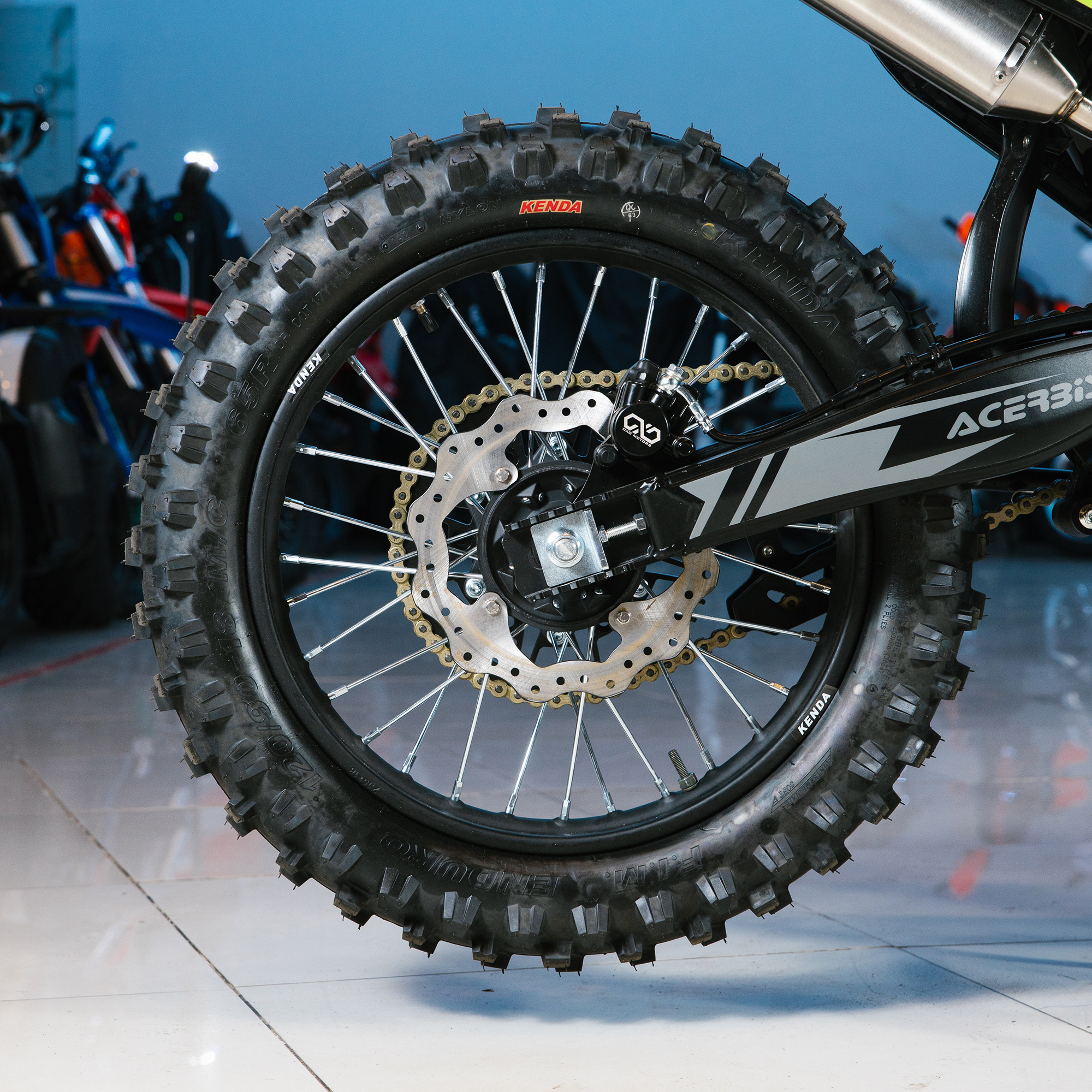 В заднем колесе установлен буксатор, который притягивает покрышку к ободу, позволяя ездить по бездорожью при низком давлении в камерах, не давая покрышке проворачиваться во время езды. Размер передней покрышки: 80/100-21. Размер задней покрышки: 120/100-18. Резина KENDA прекрасно себя ведет по песку и грязи, что позволяет райдеру отлично себя чувствовать на пересеченной местности.