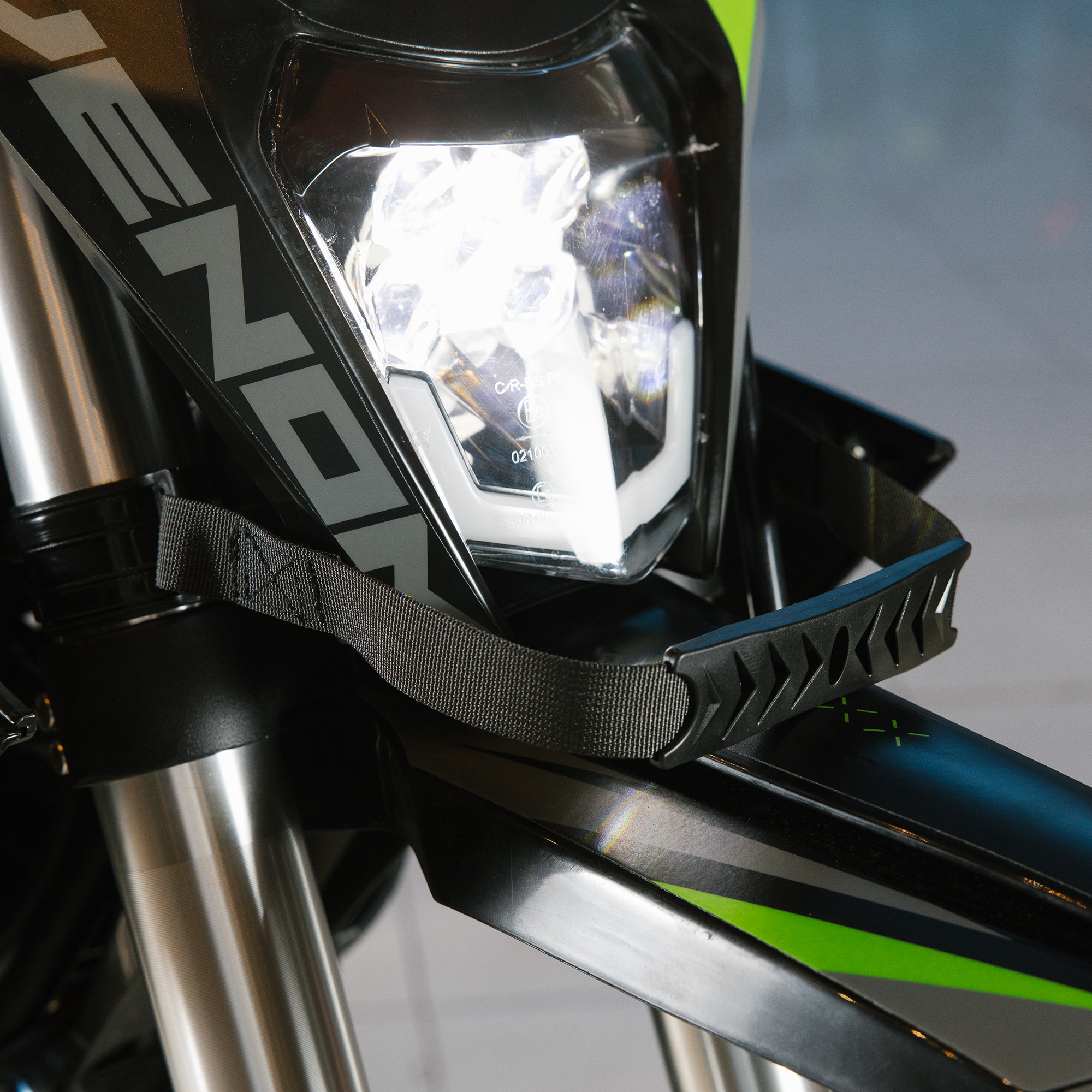 Электронная приборная панель, защита рук, буксатор заднего колеса, откидные алюминиевые рычаги, алюминиевая лапка КПП, пульт света КТМ, LED фара 5 линз, стропы, 520 цепь CHOHO
