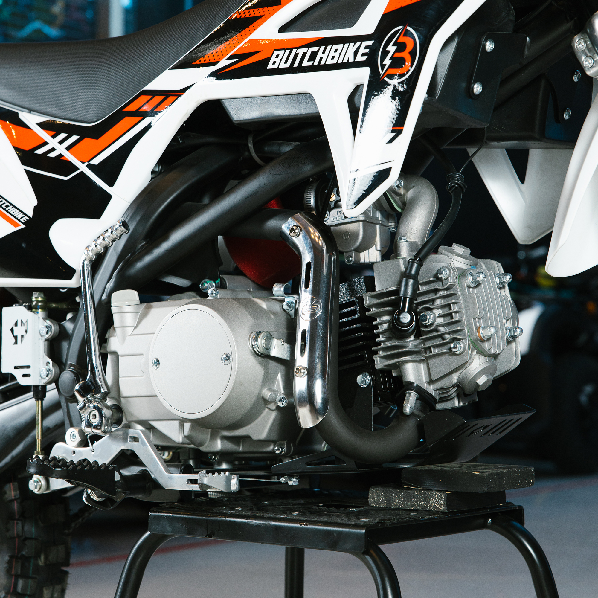 Butchbike MX1 125 не только мощный, но и удобный в использовании. По сравнению с другими питбайками, Butchbike MX1 имеет достаточно удобную посадку, которая идеально подойдет для людей с ротом от 155см до 188см. Рама изготовлена из стали, форма "клетка", что обеспечивает ей долговечность и устойчивость к длительным нагрузкам. Кроме того, приемная труба глушителя проходит во внутренней части рамы, что позволит избежать ожогов и делает вашу посадку на питбайке более комфортной.