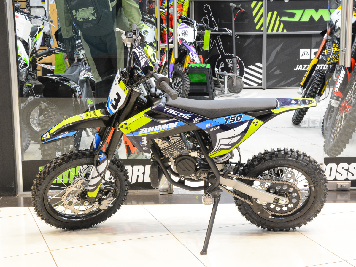 Перед вами питбайк Zuumav, у него хром-молибденовая рама. Двигатель ZM 50 2Т, 49 сс (в паре с карбюратором PZ18) у него 10 лошадиных сил. и автоматическая КПП. Алюминивые обода и колеса 14/12. Передняя вилка перевернутого типа YX 45/48-650, задний амортизатор YX 270 мм. Звезды 14/47 и стальной маятник.