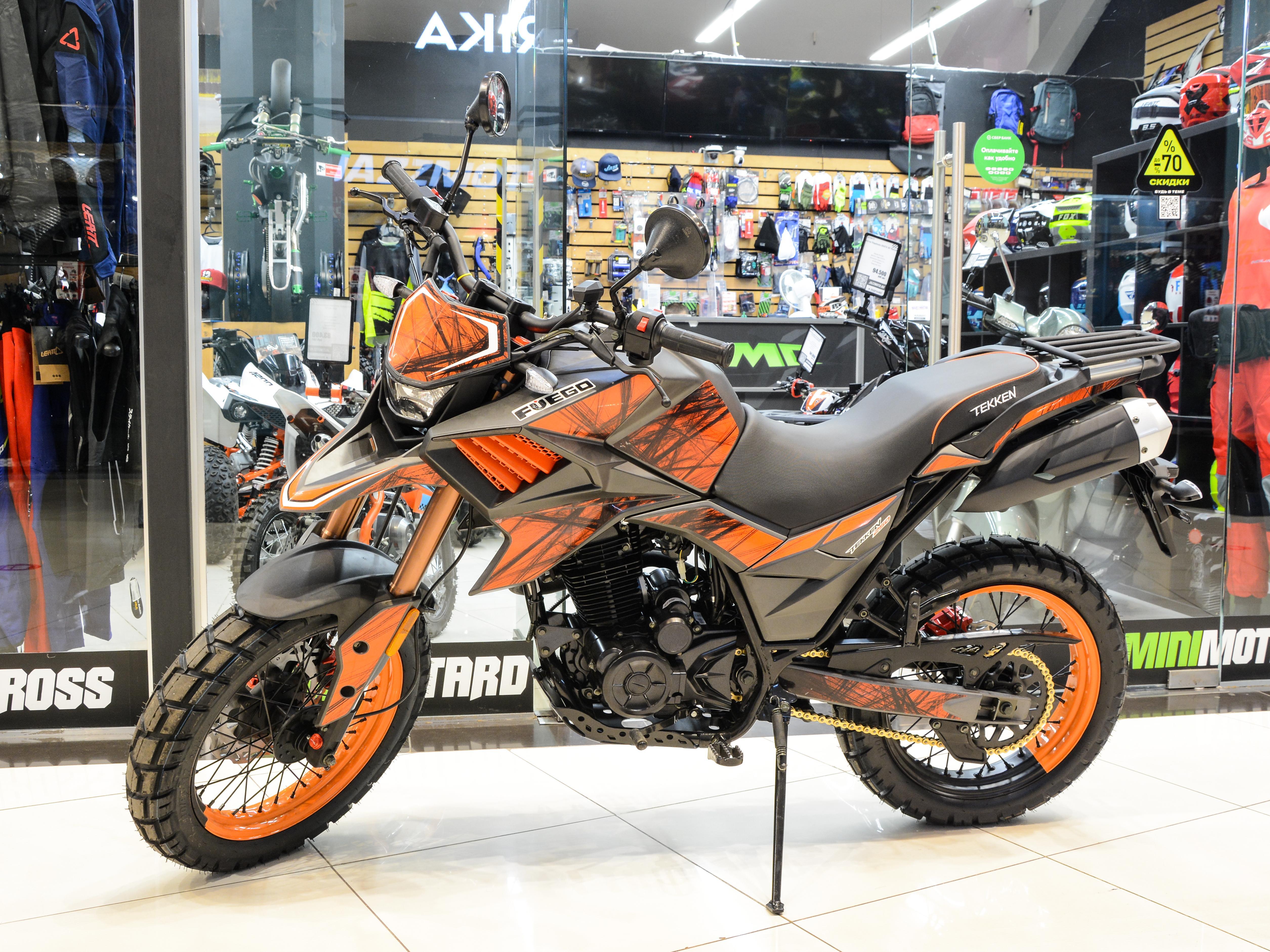 Массивные колеса R17 придают мотоциклу Tekken 250 внушительный внешний вид. Шины с неглубоким протектором обеспечивают надежное сцепление с грунтом и большое пятно контакта на асфальте. Спицованные диски защищают от грязи.