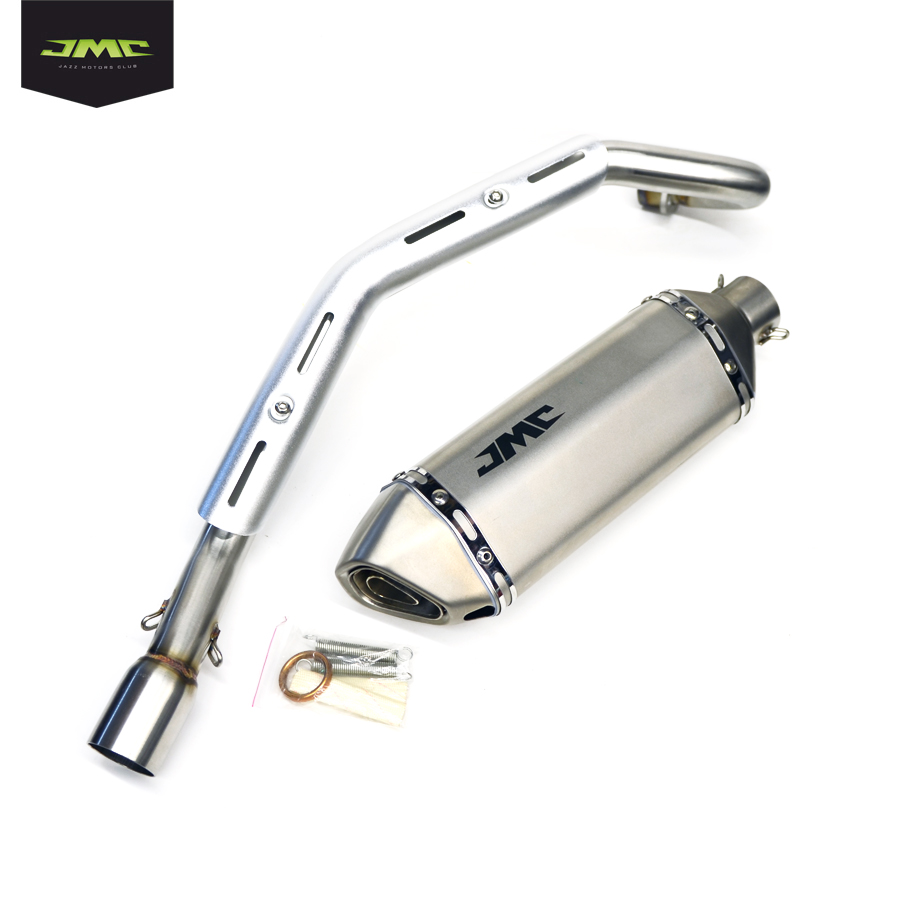 Полный комплект элементов выхлопной системы состоит из глушителя, выхлопного патрубка, пружин и уплотнительной омедненной шайбы. Выхлопной патрубок изготовлен из нержавеющей стали.  Банка глушителя изготовлена по технологиям ведущих производителей. Выхлопная система может быть применена на питбайках разных моделей и производителей.